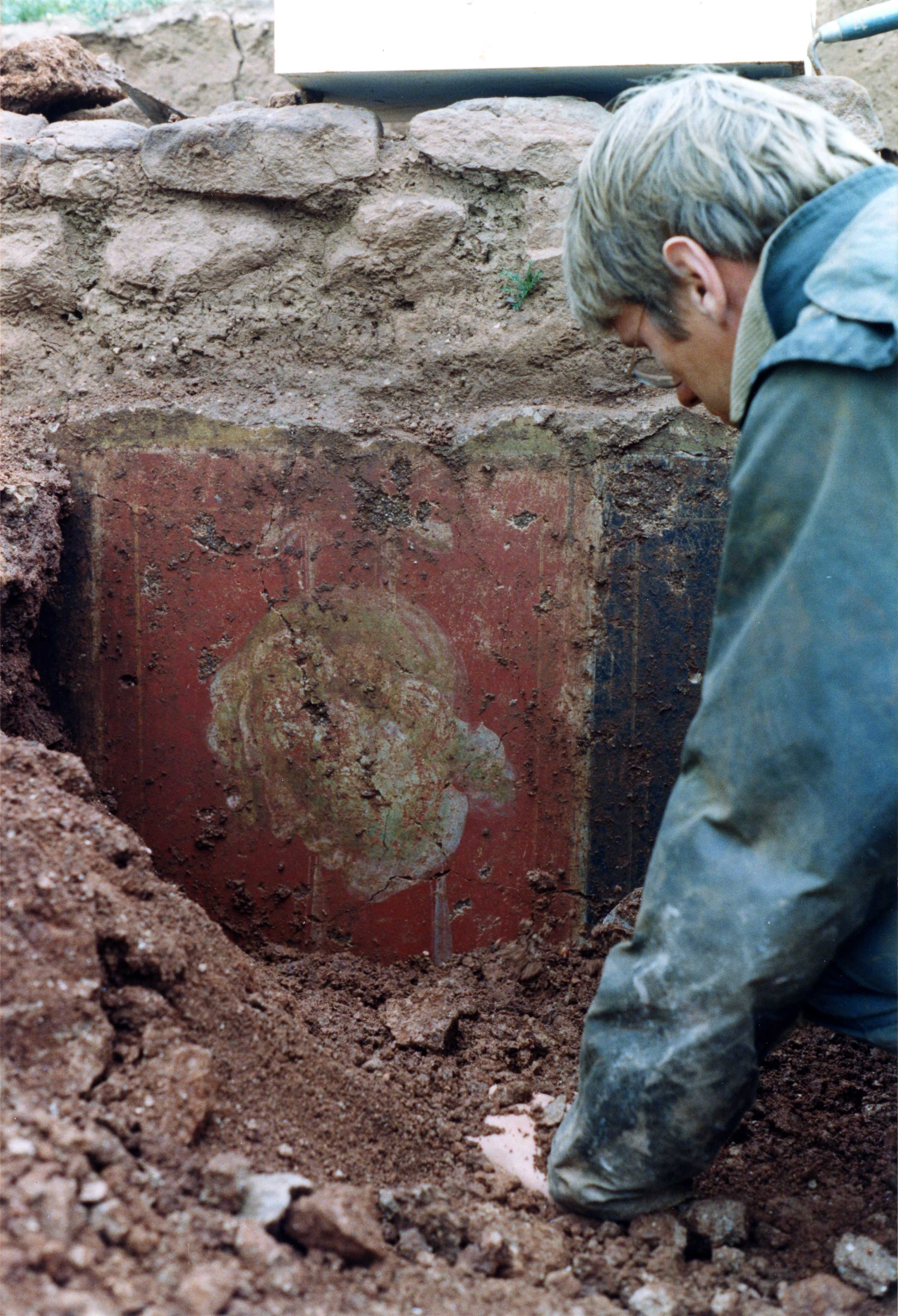 Schicht für Schicht lagerten sich die Bruchstücke in dem 1,50 m schmalen Gang beziehungsweise Raum 4, ab. Beispielhaft die Nordwestecke in Raum 4, neben dem Durchgang vom Zentralraum 2 zu Raum 5 mit der, noch an der Wand anhaftenden, Theatermaske: Wandmalerei VII. Links der aufgetürmte Schuttberg mit den Wandmalereiresten aus dem Gang 4 mit Blickrichtung nach Westen (siehe Abb. 13). Später fielen die losen Mauersteine obenauf, Regenwasser löste über Jahrhunderte den Hangboden auf, schwemmte als mächtigen Erdauftrag die Trümmerstelle zu und konservierte so den historischen Schatz - hangseitig blieben die Mauern bis zu einer Höhe von 1,40 m erhalten. Schließlich überzog feinster Lehmschlicker nebenan in Raum 1 zentimeterdick den bunten Teppich aus tausenden von Steinchen und färbte diesen rötlich ein. Ein Glücksfall für die Archäologen!