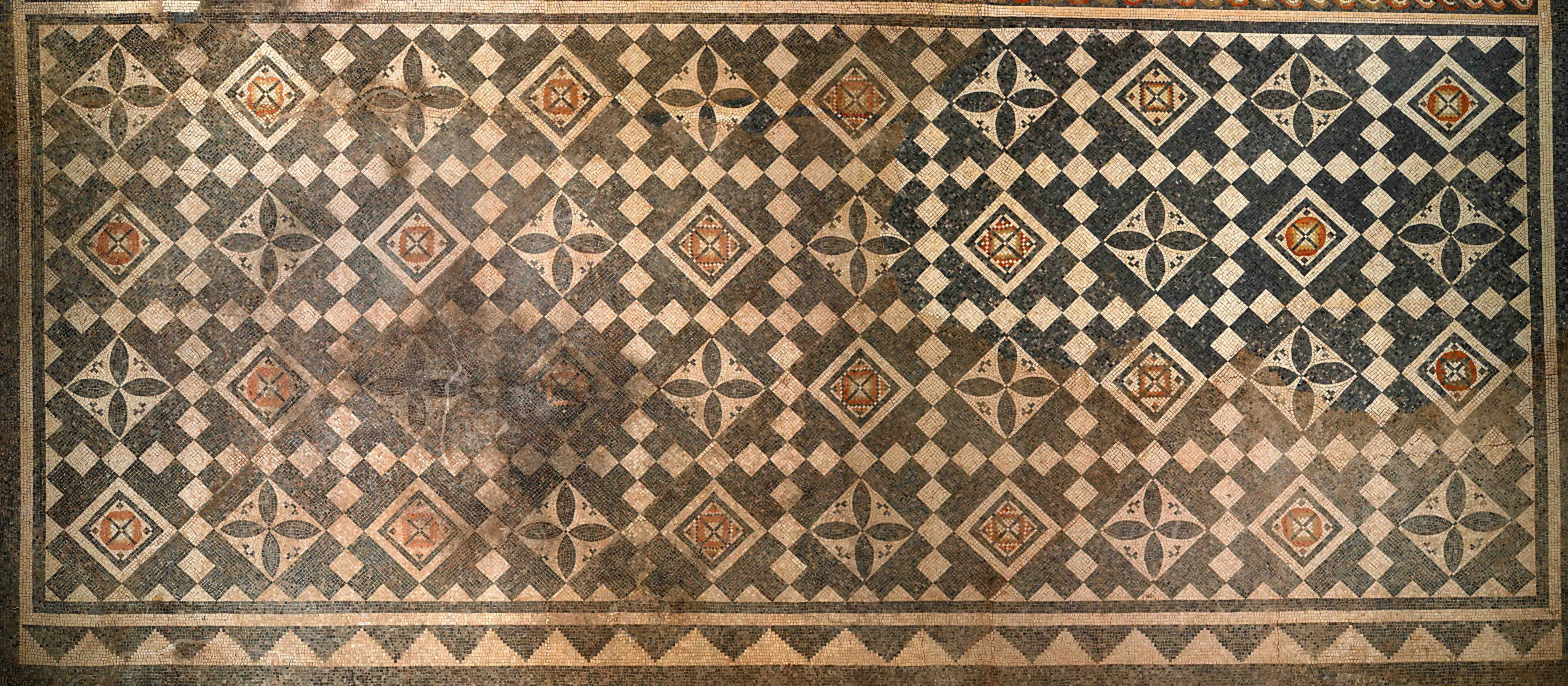 Durch sich kreuzenden Reihen von kleinen, diagonalgestellten Quadraten wurde die Mosaikfläche in quadratisch wirkende Felder unterteilt. Alle Quadrate des Schachbrettgrunds berühren sich an der Spitze. So entstanden gleichgroße Felder mit diagonal gestellten, eingeschriebenen Quadraten, alternierend mit Kreuzsternblüten und Kreuzblüten als Füllmotiv. Die kassettenhafte Wirkung ist noch erkennbar. Der Rahmen der Kreuzsternblüten übernimmt die Funktion der Plastizität vermittelnden Innenbordüre, sodass das kassettenhafte der Stuck- und Architekturornamentik noch nachwirkt.