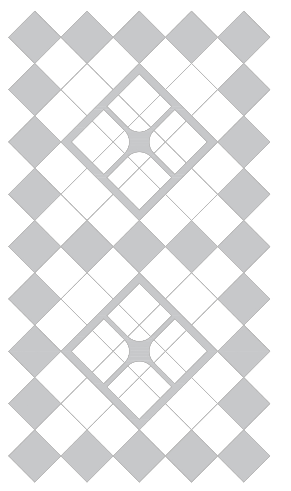 Zwanzig gefüllte Quadrate und ebenso viele Kreuzblüten beziehungsweise Vierblattrosetten, gleich einem Quadratnetz, wechseln sich im ausgesparten Rapportgrund ab und werden von einem breiten schwarzen Rahmenband umfangen. Das durch die weißen, auf der Spitze stehenden, Schnittpunktquadrate im schwarz-weißen Schachbrettmuster gebildete imaginäre Kassettenmuster umschließt den diagonalen Rapport. Zur Erhöhung der kontrastreichen Abstufung wird jeweils ein, am Quadrat anliegendes, weißes Schachbrettquadrat durch ein schwarzes ersetzt und bildet ein konkaves Achteck - mindestens ein Innenwinkel kleiner als 180 Grad. Erwähnenswert ist die Tatsache, dass das konkave Achteck eine geometrische Variante des regelmäßigen konvexen Achtecks beziehungsweise Oktogons ist. Als Folge der Umkehrung der Wertigkeitsverhältnisse, die eine Farbe als zeichnendes Element definiert, ist bei diesem Rapport die Absicht einer klaren Trennung nicht mehr möglich. Ist beim dreigliedrigen Hauptfeld Weiß als Untergrundfarbe für das Muster klar erkennbar, so fällt die Entscheidung für den Vorteppich nicht leicht, da man je nach Betrachtungsweise - ein sowohl als auch - eine schwarze Zeichnung auf weißem Grund oder eine weiße Zeichnung auf schwarzen Grund sieht.